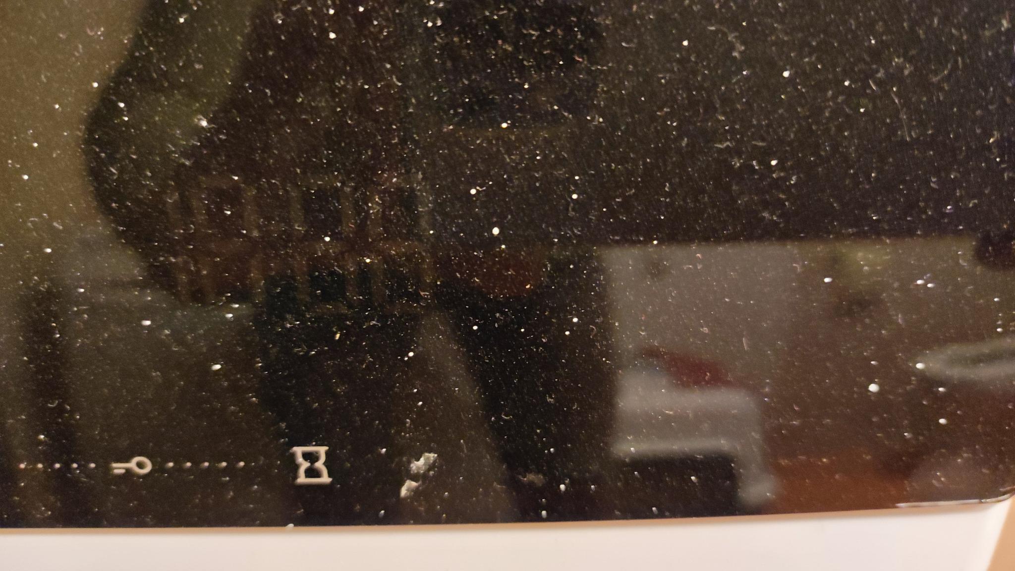 Slabo: Pri pleskanju površin ni ustrezno zaščitil, zato je bilo na koncu celo stanovanje prekrito z drobnimi belimi kapljicami, ki smo jih zelo dolgo čistilli. Na sliki je primer na pralnem stroju, ampak te kapljice so bile res povsod. Večje packe je za seboj sicer počistil, vendar je pri tem konkretno razil vrata hladilnika.