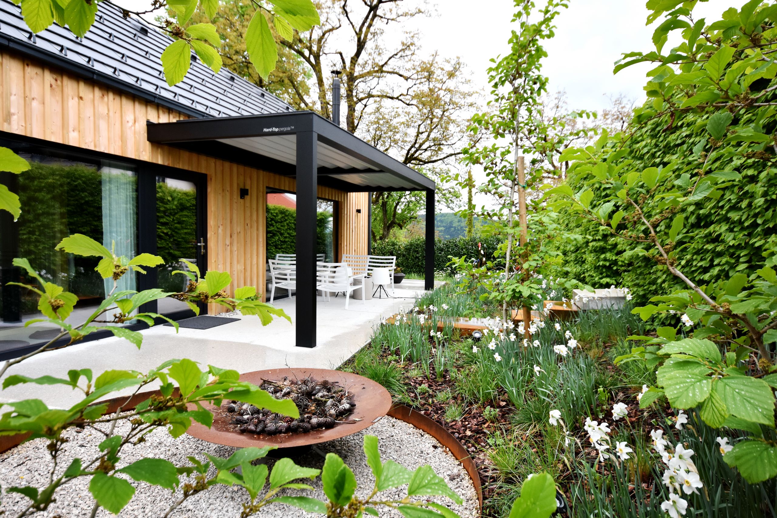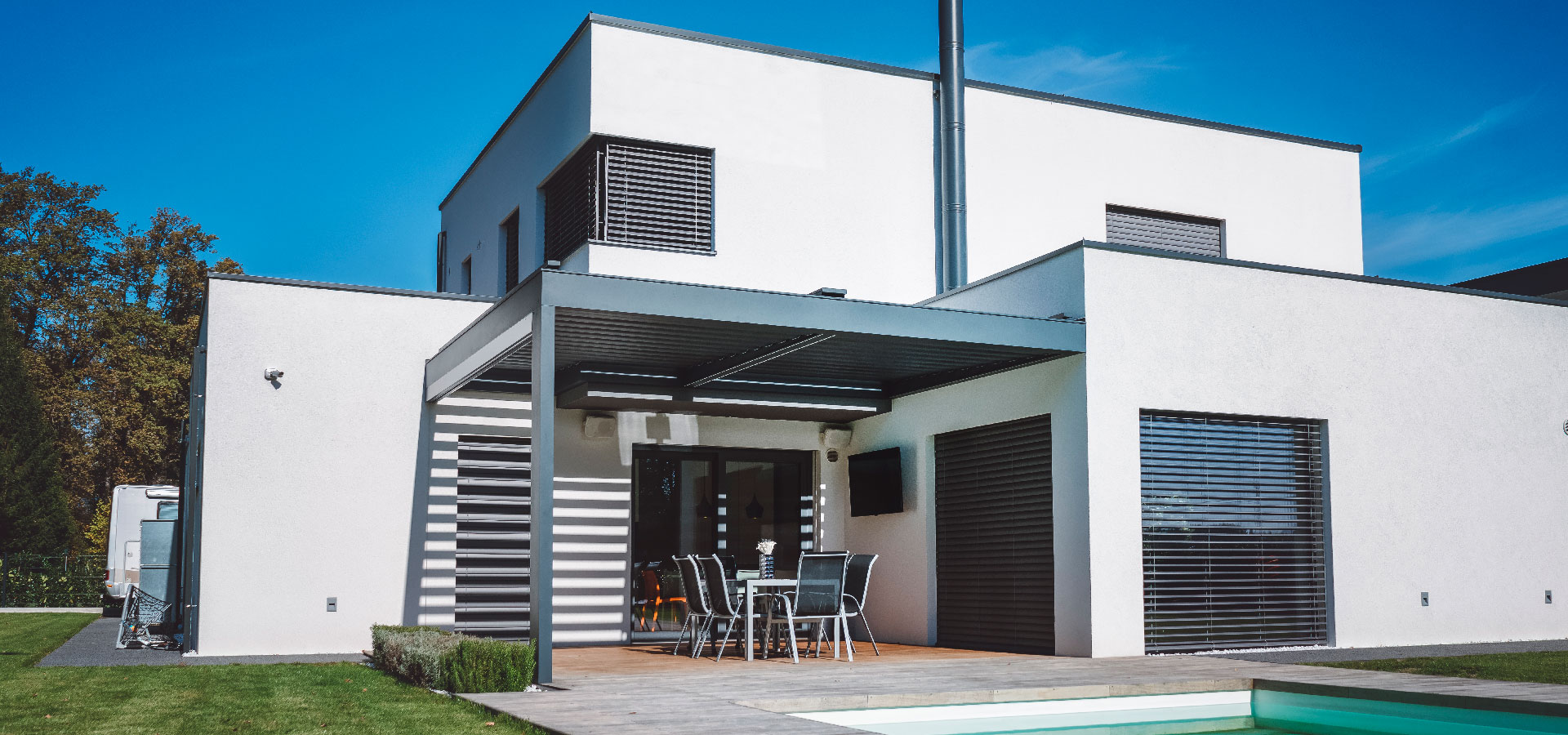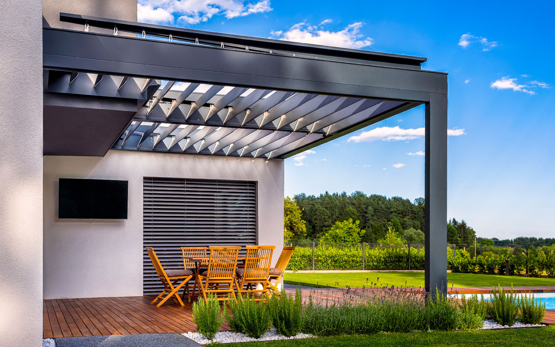 Hard-Top pergola je moderen arhitekturni element najvišje kvalitete, ki z motorno rotacijo lamel regulirano prepušča do 80 % sonca kadar to želite, zadrži pomladanski ali jesenski naliv, vas ščiti pred vročim poletnim soncem in vnaša sonce ali ohrani teraso suho tudi pozimi. Podaljšajte uporabnost vaše terase na vse dni v letu.