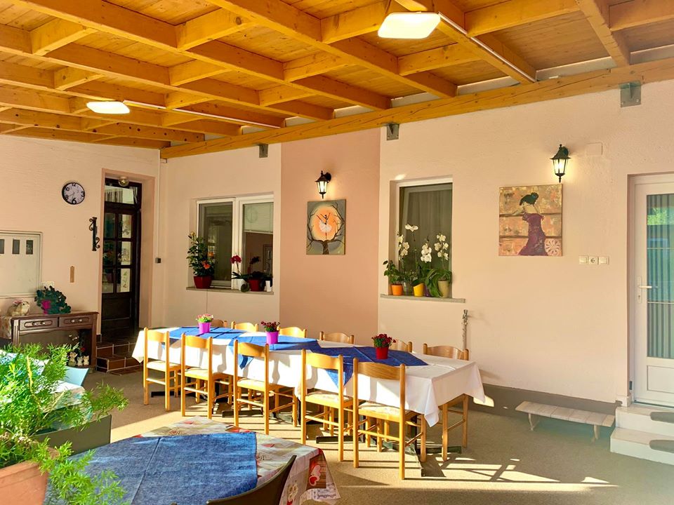 Skupini je na voljo zaprta terasa z gretjem, zvočnikom, mikrofonom, mizami in stoli.